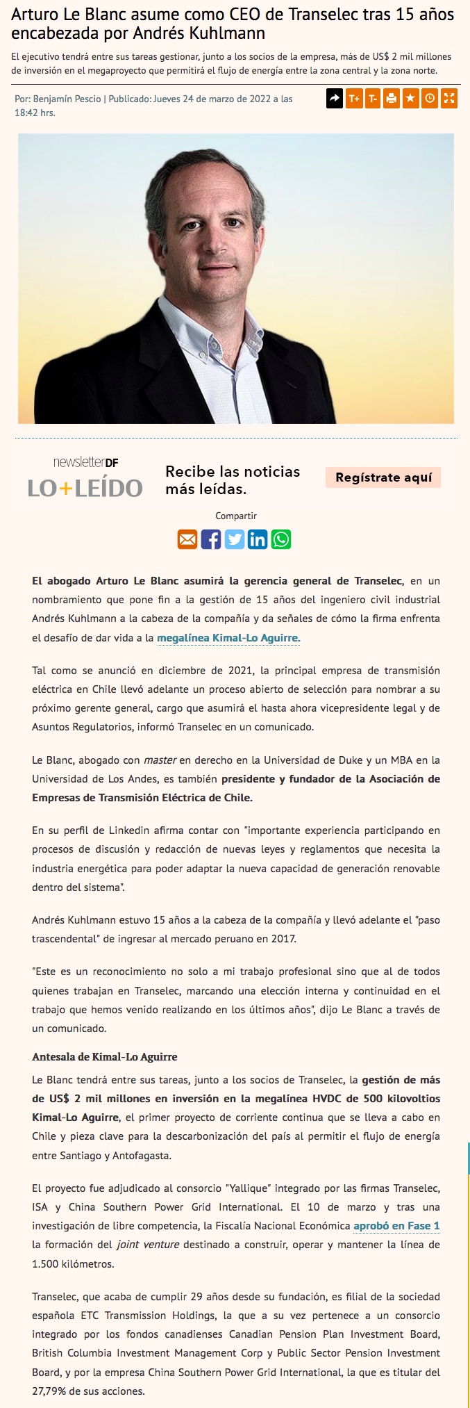 Arturo le Blanc asume gerencia general de Transelec tras salida de Andrés Kuhlmann - (La Tercera Online)