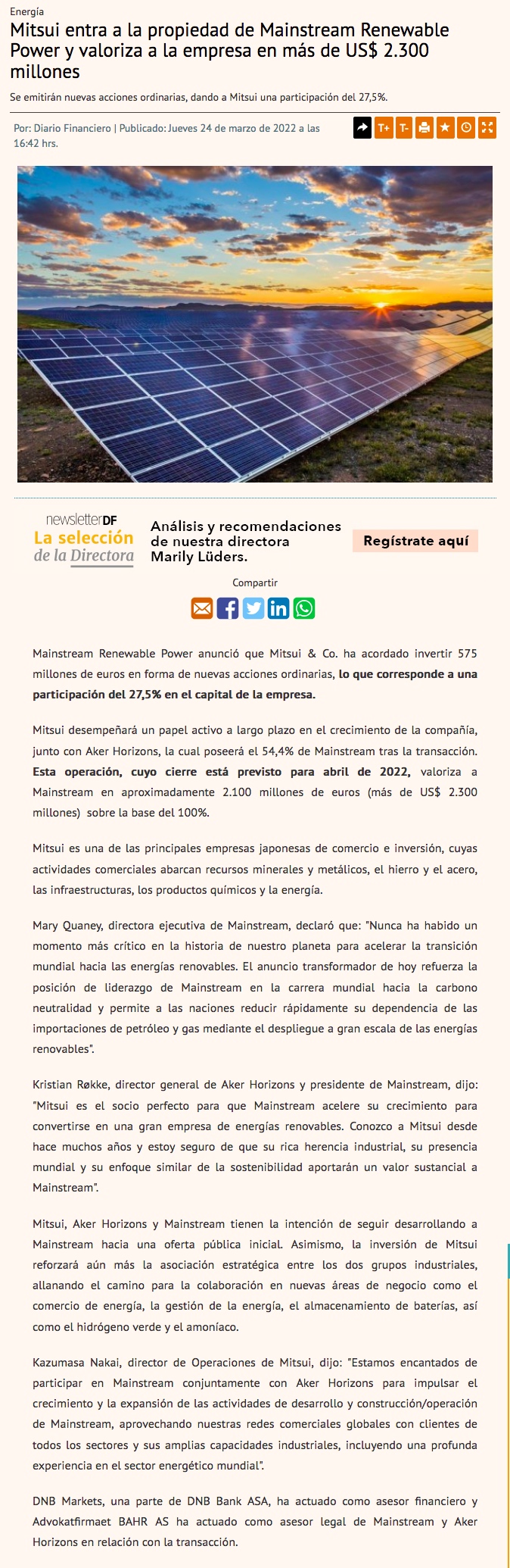 Mitsui se une como inversionista estratégico a largo plazo en Mainstream - (La Tercera Online)