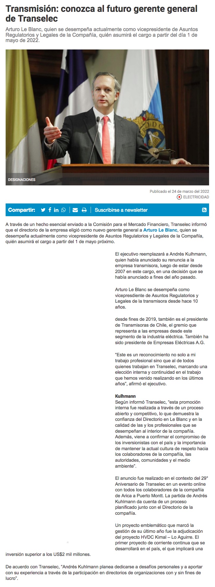 Arturo le Blanc asume gerencia general de Transelec tras salida de Andrés Kuhlmann - (La Tercera Online)