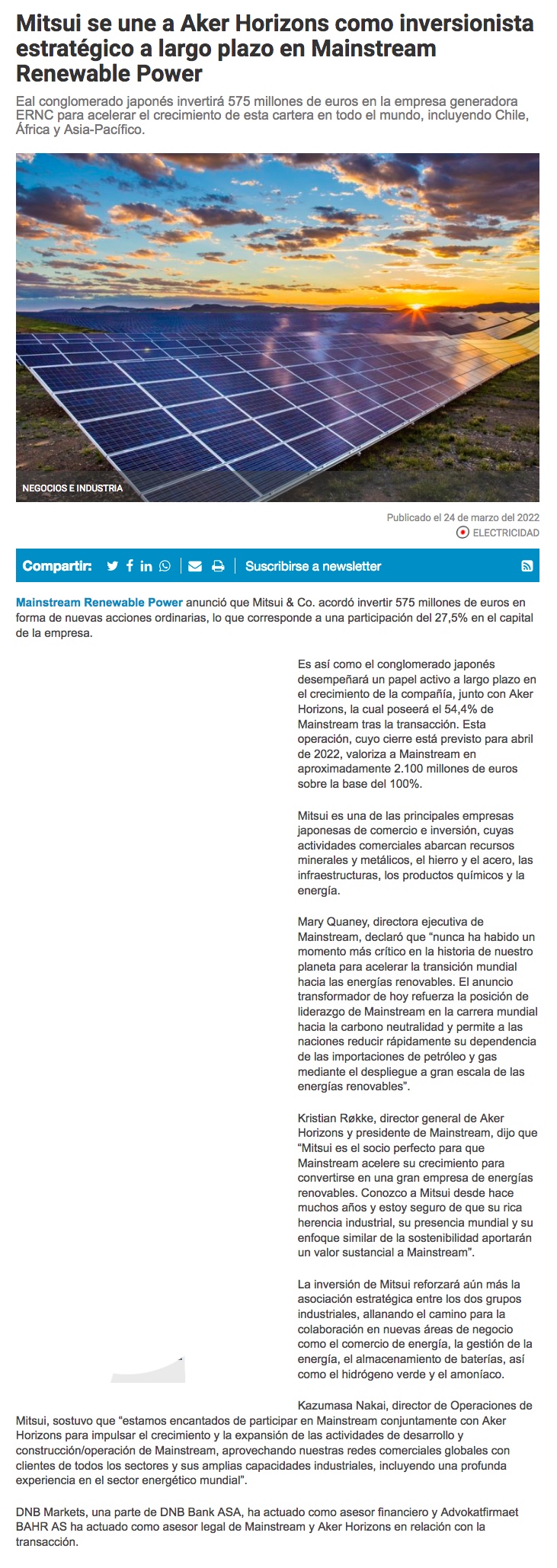 Mitsui se une como inversionista estratégico a largo plazo en Mainstream - (La Tercera Online)