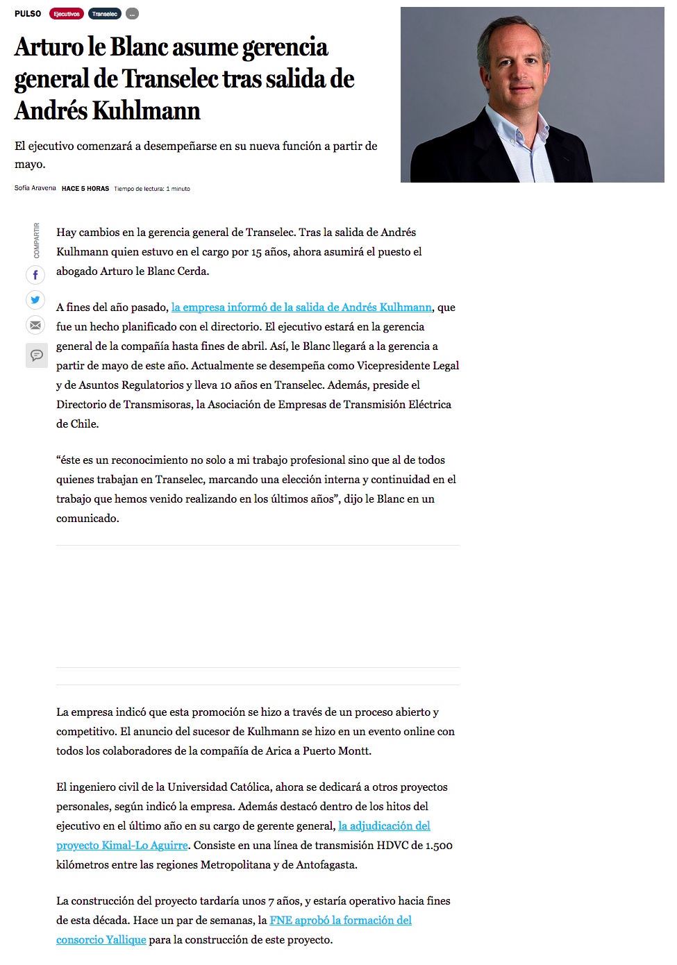 Arturo Le Blanc asume como CEO de Transelec tras 15 años encabezada por Andrés Kuhlmann - (DF Online)