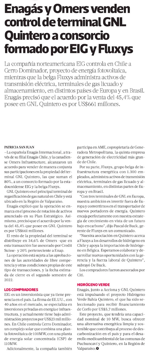 Enagás y Omers venden participación en GNL Quintero - (El Mercurio de Santiago)