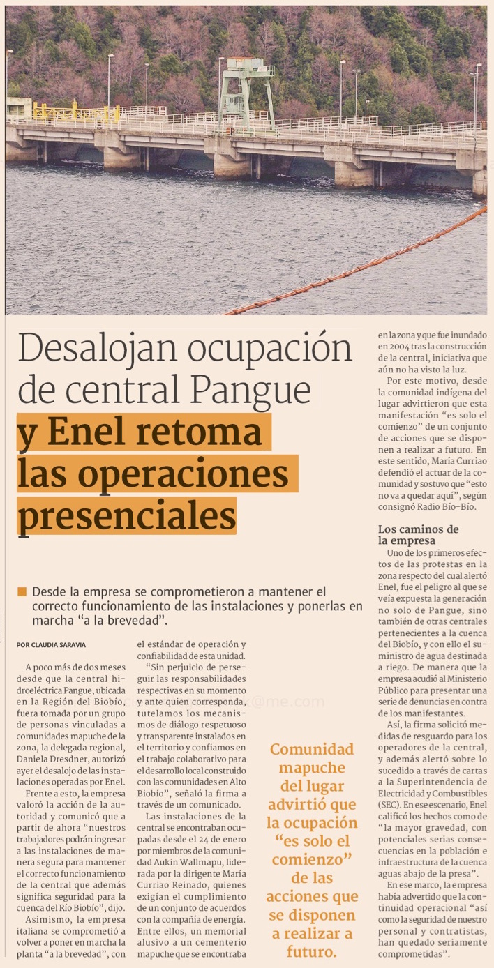 Central Pangue es desalojada y Enel retoma operaciones tras bloqueo - (Pulso)