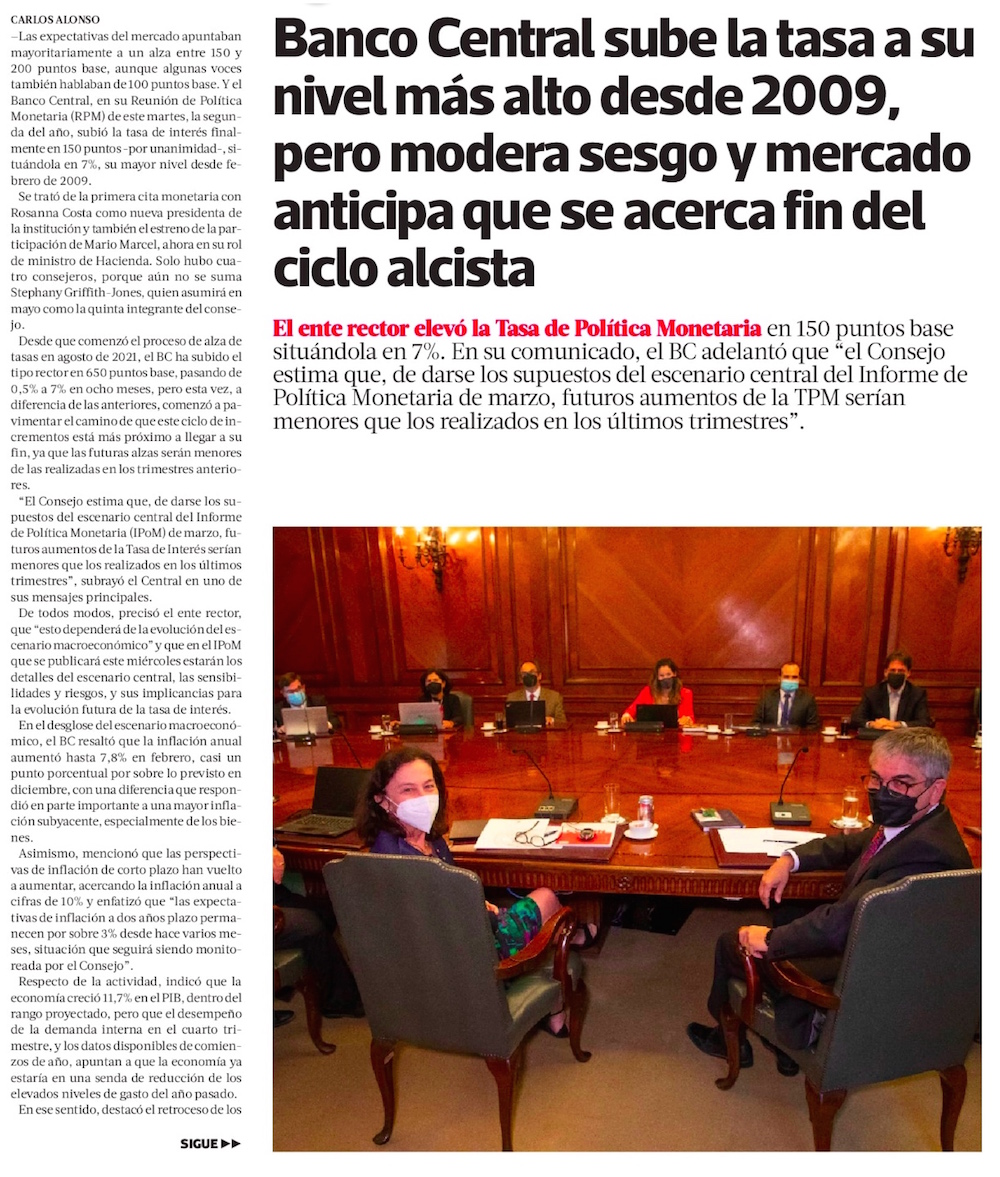 Ante presión inflacionaria, BC sube tasa de interés a 7%, su mayor nivel en 13 años - (El Mercurio de Santiago)