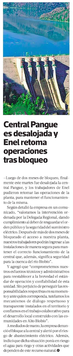 Retoman operaciones en central Pangue tras desalojo de manifestantes - (El Sur)