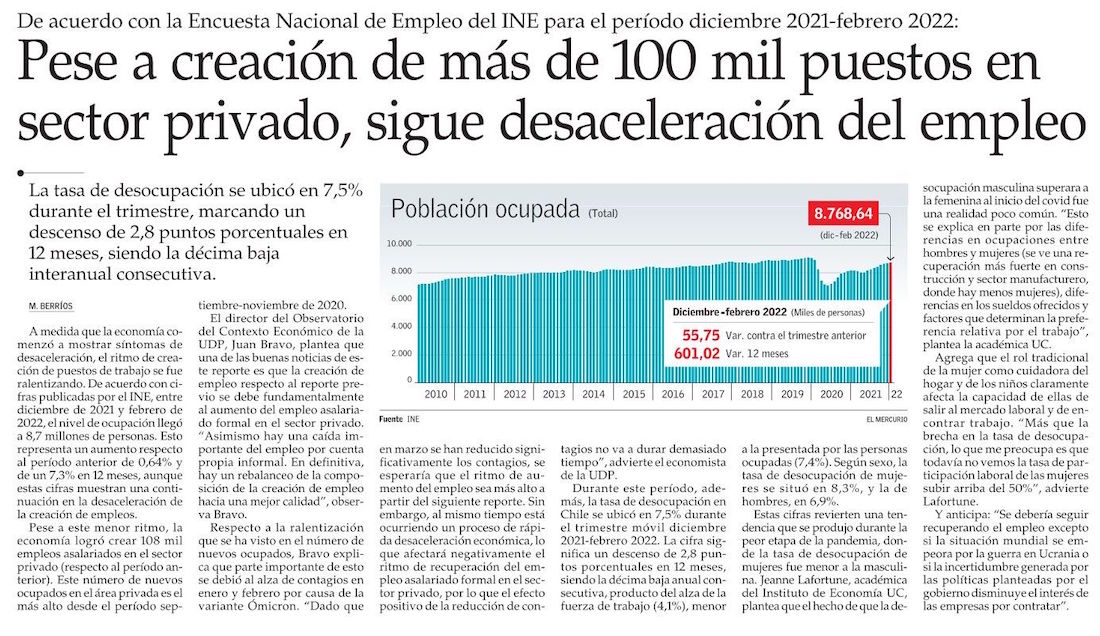 Baja ritmo de repunte laboral y aún faltan casi 300 mil trabajos para volver a nivel prepandemia - (Diario Financiero)