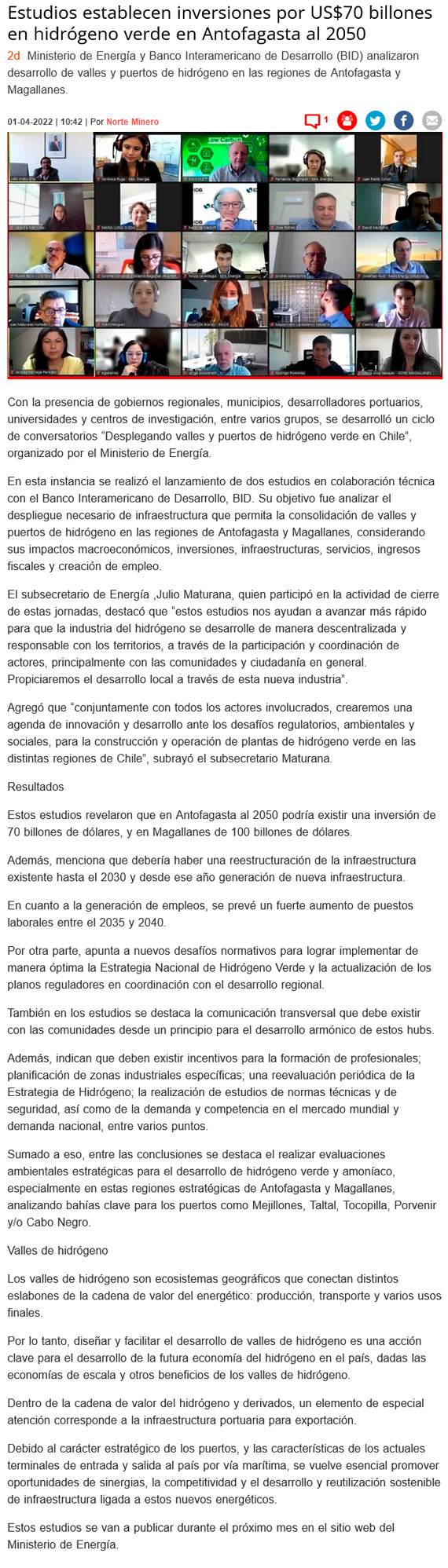 Estudios sobre hidrógeno verde estiman que la Región recibirá inversiones por US$ 70 billones - (El Mercurio de Antofagasta)