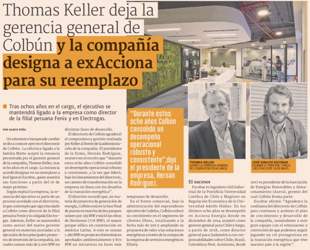Thomas Keller renuncia a gerencia general de Colbún y directorio nombra a José Ignacio Escobar en su reemplazo - (Pulso)