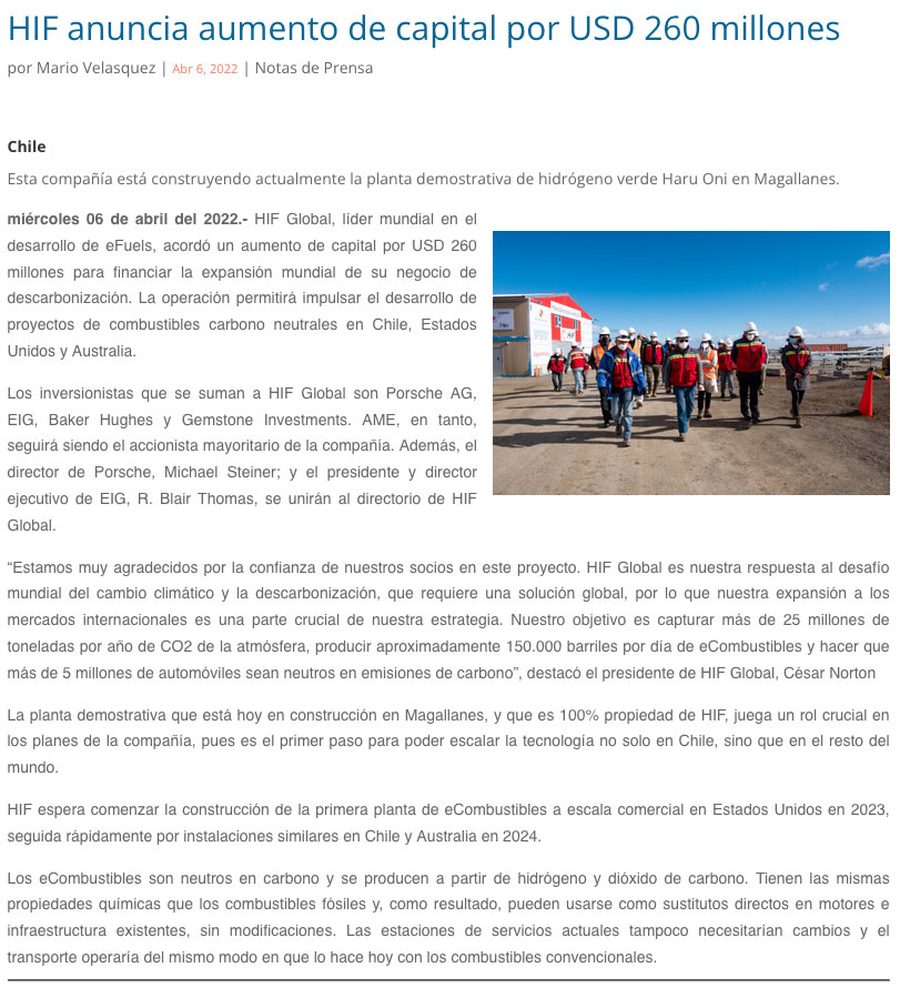 e-combustibles: HIF Global realizará aumento de capital por US$260 millones - (revistaei.cl)