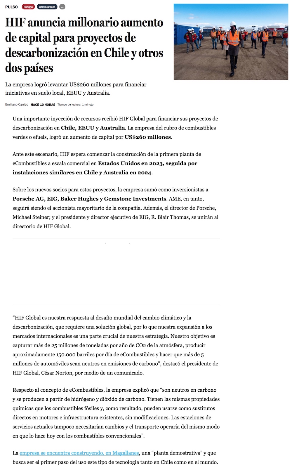 e-combustibles: HIF Global realizará aumento de capital por US$260 millones - (revistaei.cl)