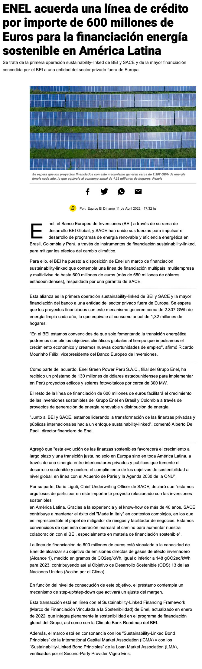 Enel cierra una línea de crédito por US$ 650 millones para inversiones sostenibles en A. Latina - (americaeconomia online)
