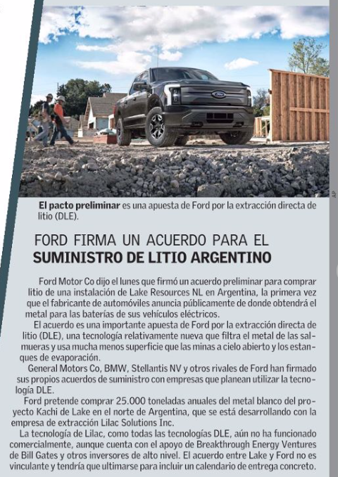 Ford llega a un acuerdo para comprar litio de Argentina para sus autos eléctricos - (emol)