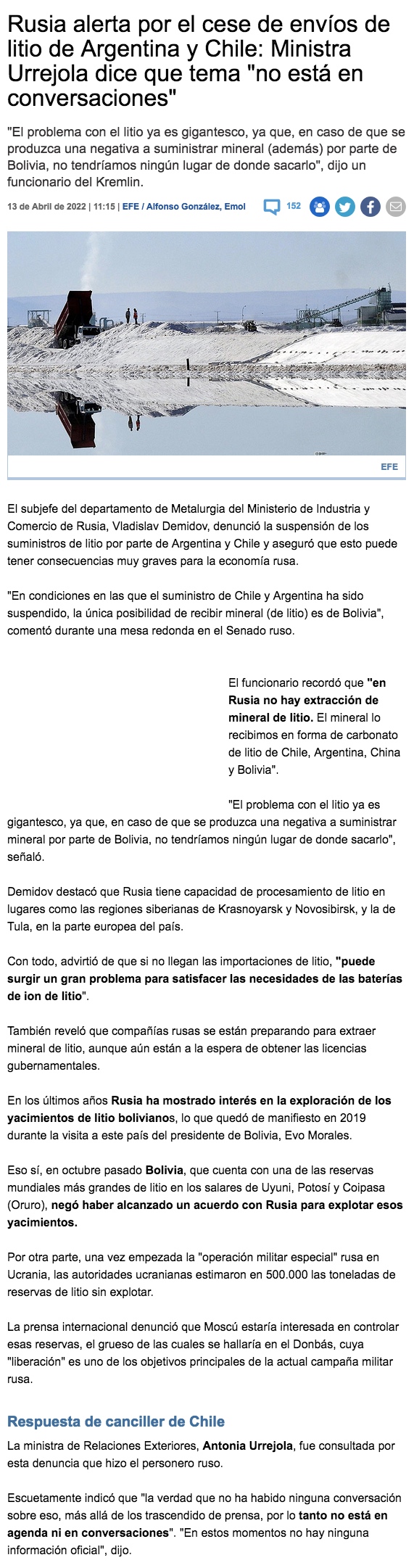 Rusia denuncia el cese de envíos de litio desde Chile y Argentina, y advierte graves consecuencias - (Medios Regionales Cadena El Mercurio)