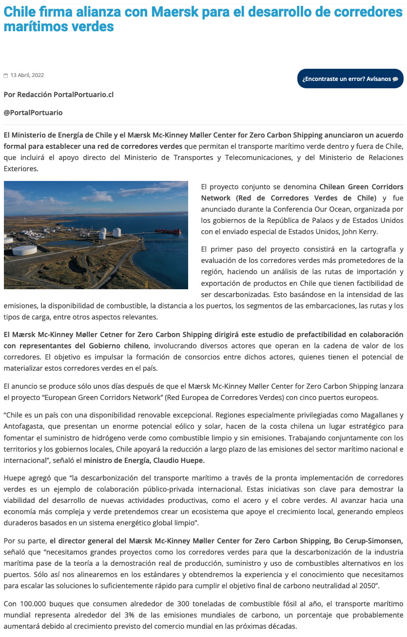 El Ministerio de Energía de Chile y el Mærsk Mc-Kinney Møller Center for Zero Carbon Shipping establecerán corredores marítimos verdes en Chile - (h2news.cl)