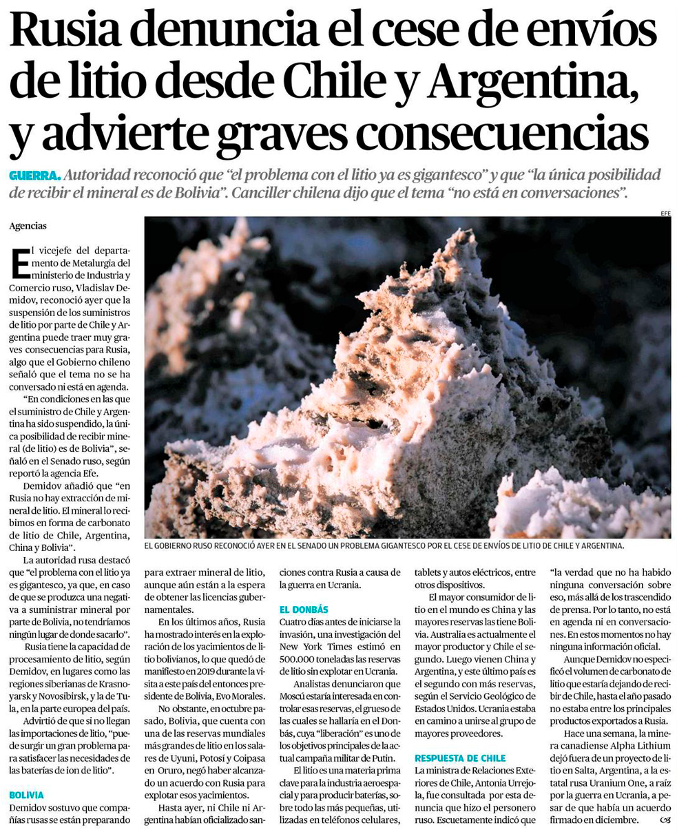 Rusia admite la gravedad del cese de los envíos de litio de Chile y Argentina - (El Mostrador)
