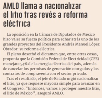 Tras rechazo a la reforma eléctrica, López Obrador espera que Cámara de Diputados trate la "nacionalización" del litio - (americaeconomia online)