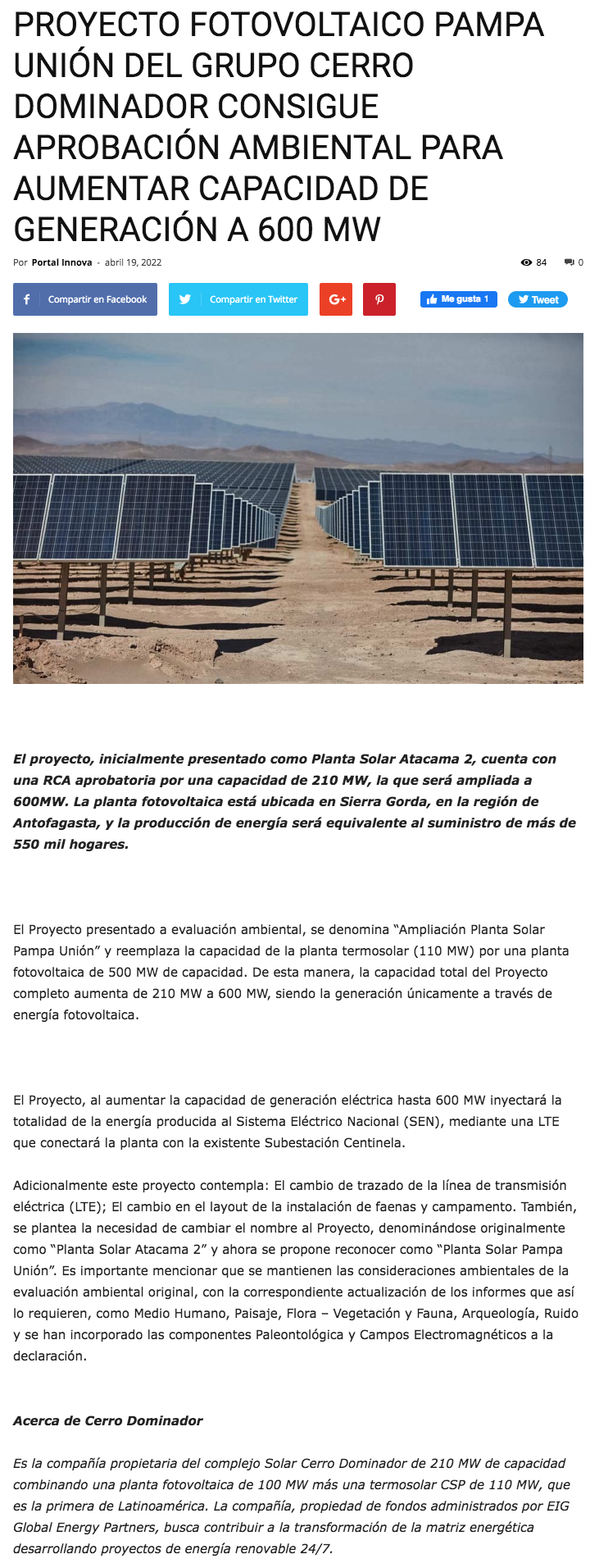 Proyecto «Ampliación Planta Solar Pampa Unión» de Cerro Dominador obtuvo luz verde ambiental - (sustentable.cl)