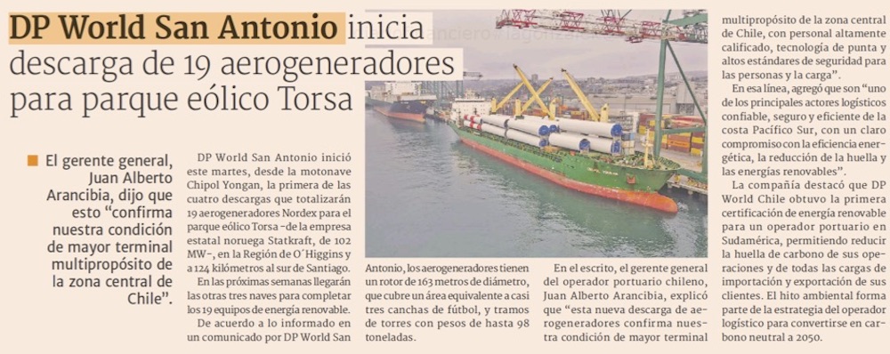 DP World San Antonio inicia descargas de 19 aerogeneradores para parque eólico Torsa de 102 MW - (El Mercurio de Santiago)