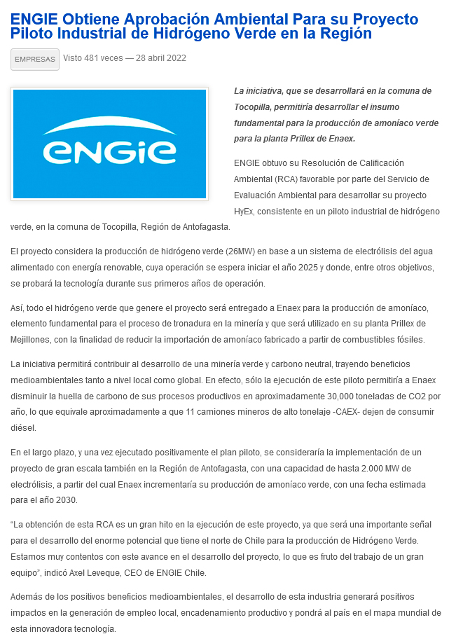 SEA aprueba piloto industrial de hidrógeno verde en Tocopilla - (reporteminero)