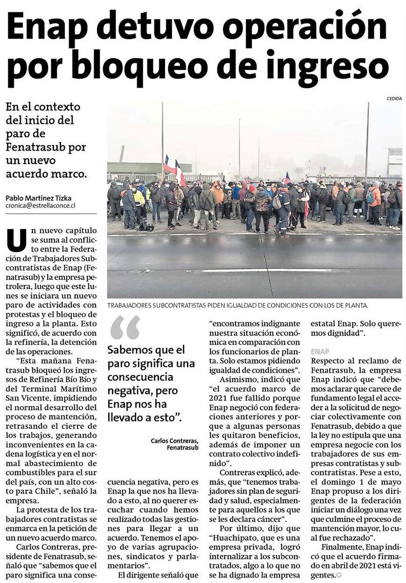 Detienen funcionamiento en planta de Enap por huelga de contratistas - (El Sur)