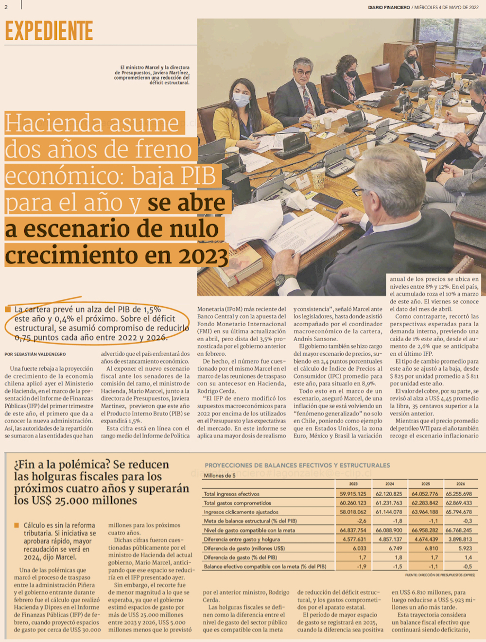 Marcel ajusta proyección de crecimiento y fija que deuda pública no supere 45% del PIB - (El Mercurio de Santiago)