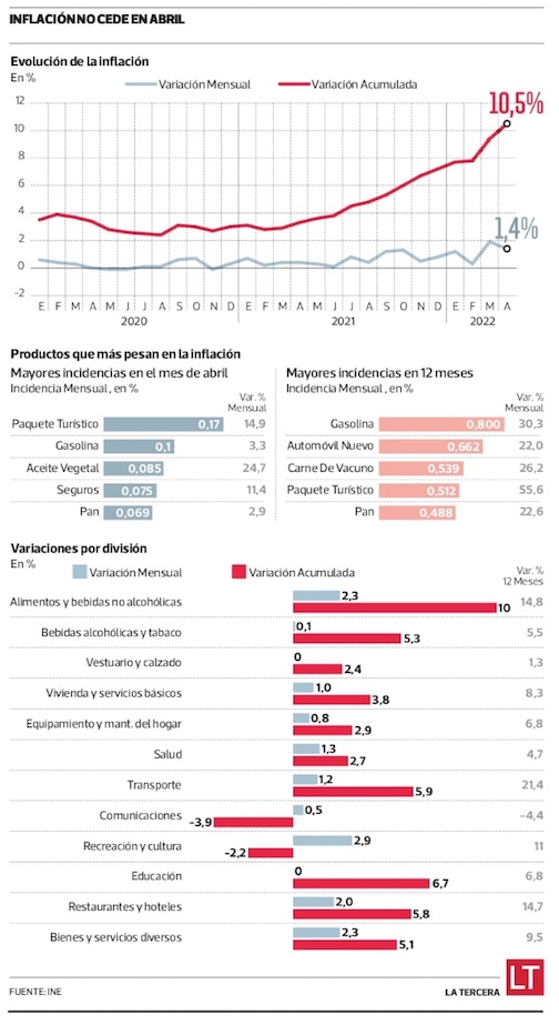 Inflación anual sube a 10,5%, la más alta en 28 años, y pone presión a tasas y deudas en UF - (El Mercurio de Santiago)