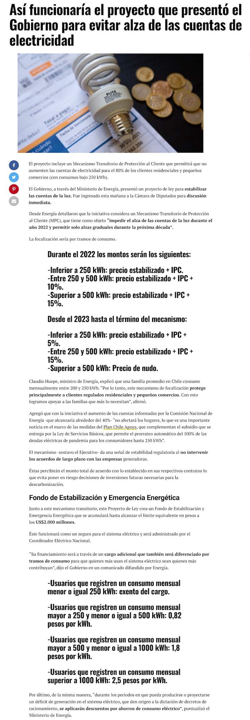 El detalle del proyecto para estabilizar las cuentas de la luz al 80% de los clientes regulados durante todo el 2022 - (emol)