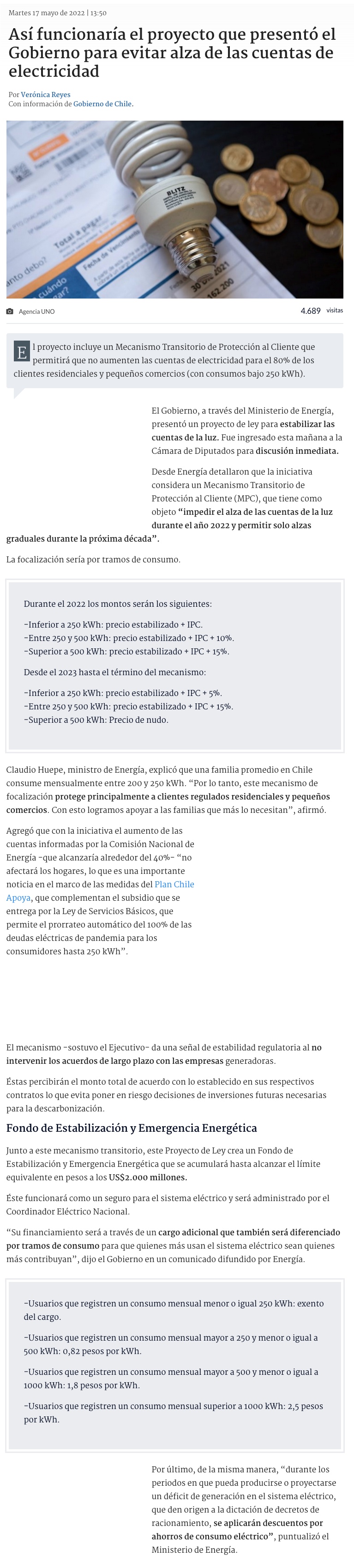 El detalle del proyecto para estabilizar las cuentas de la luz al 80% de los clientes regulados durante todo el 2022 - (emol)
