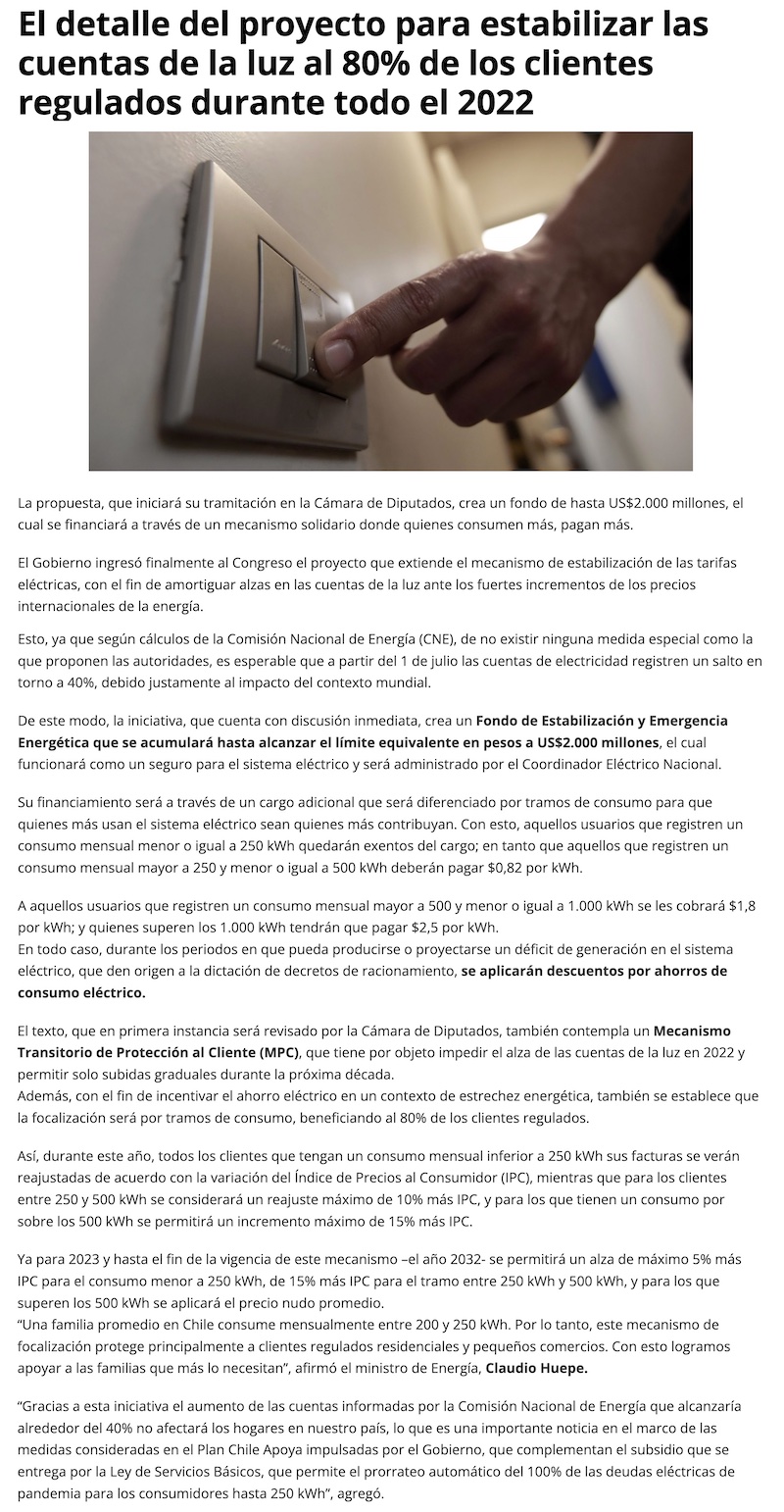 El detalle del proyecto para estabilizar las cuentas de la luz al 80% de los clientes regulados durante todo el 2022 - (emol)