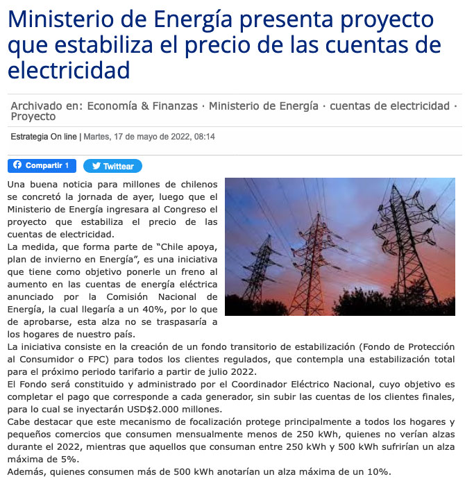 Ingresa Proyecto de Ley que permitirá que no aumenten los precios de la electricidad - (revistaei.cl)