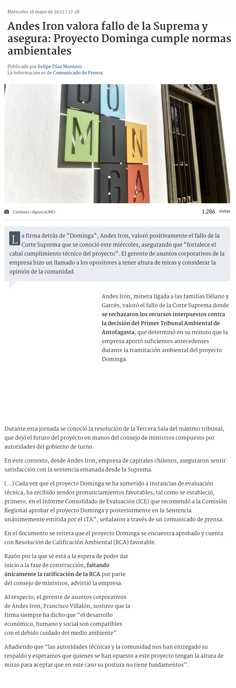 Suprema rechaza recurso contra Dominga y futuro del proyecto queda en manos del Comité de Ministros - (Diario Financiero)