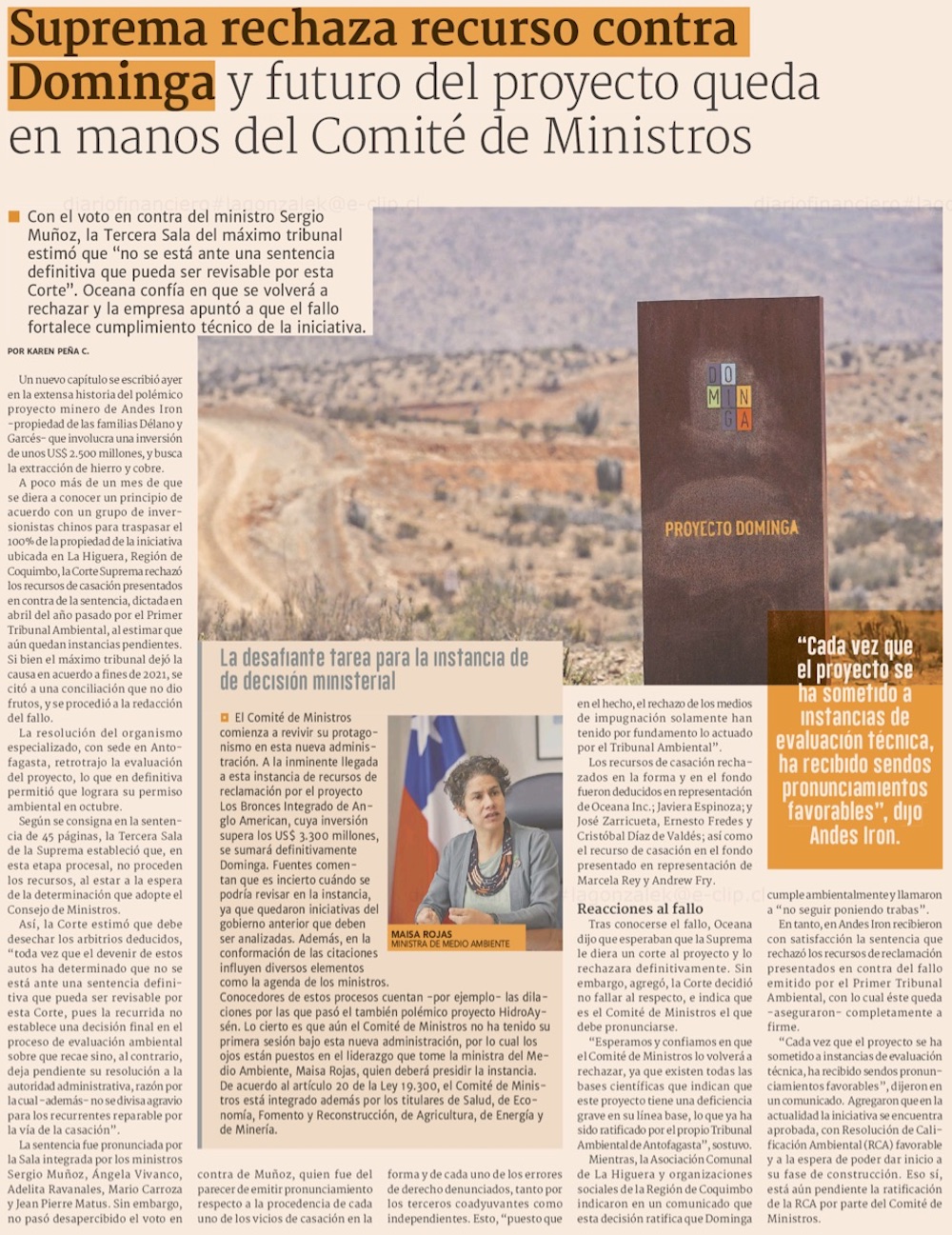 Dominga supera proceso judicial y su futuro queda en manos del Comité de Ministros - (El Mercurio de Santiago)