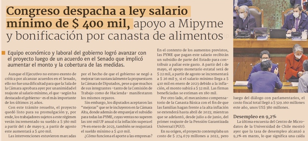 Congreso despacha a ley salario mínimo y se aplicará de modo retroactivo - (El Mercurio de Santiago)