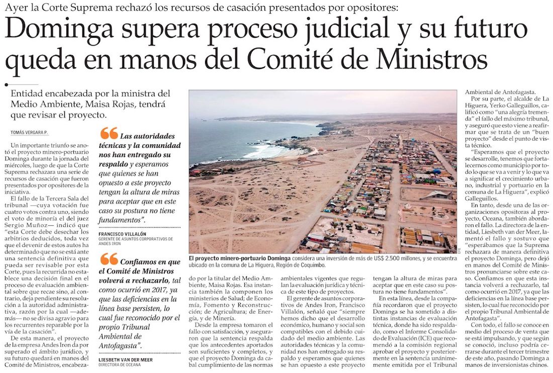 Suprema rechaza recurso contra Dominga y futuro del proyecto queda en manos del Comité de Ministros - (Diario Financiero)
