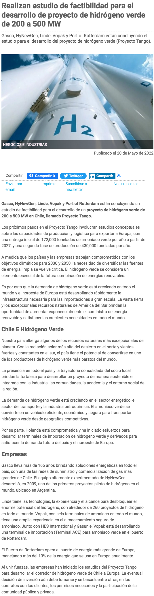 Realizan estudio de factibilidad para el desarrollo de proyecto de hidrógeno verde de 200 a 500 MW - (revistaei.cl)