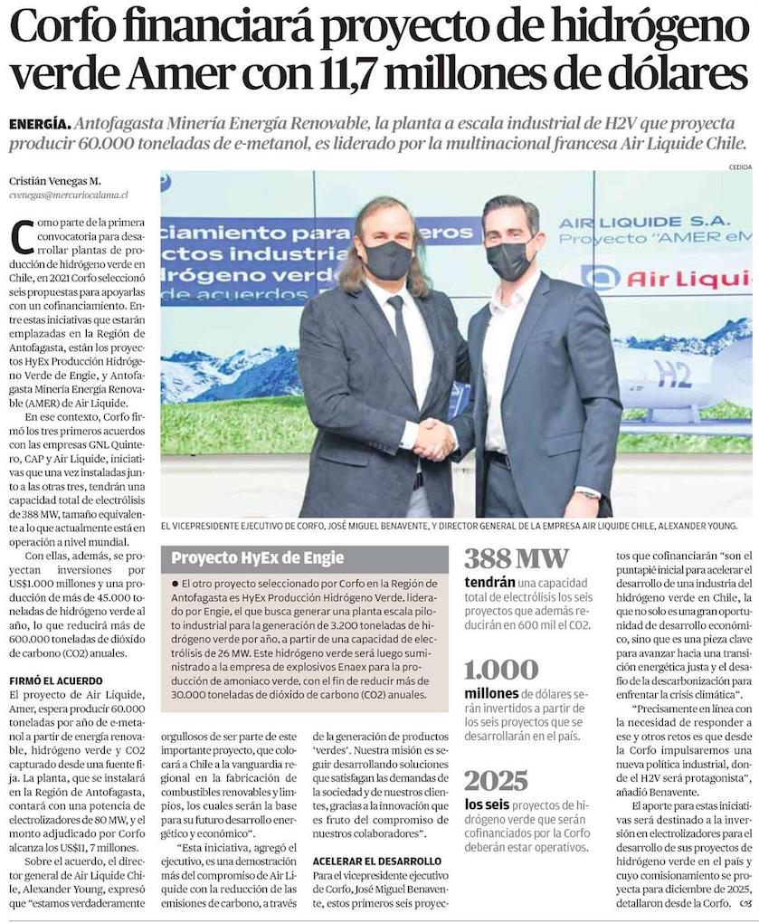 Corfo financiará proyecto de hidrógeno verde Amer con 11,7 millones de dólares - (El Mercurio de Calama)