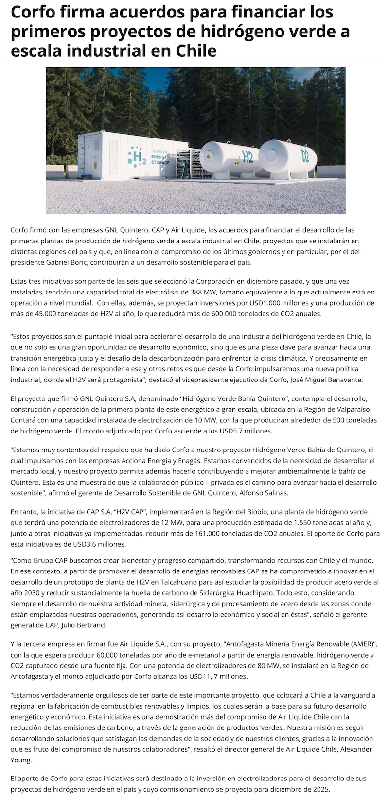 Corfo financiará proyecto de hidrógeno verde Amer con 11,7 millones de dólares - (El Mercurio de Antofagasta)