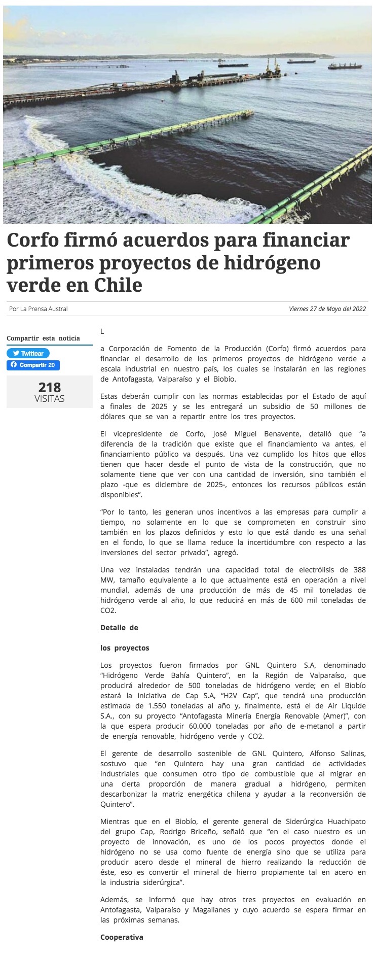 Corfo financiará proyecto de hidrógeno verde Amer con 11,7 millones de dólares - (El Mercurio de Antofagasta)