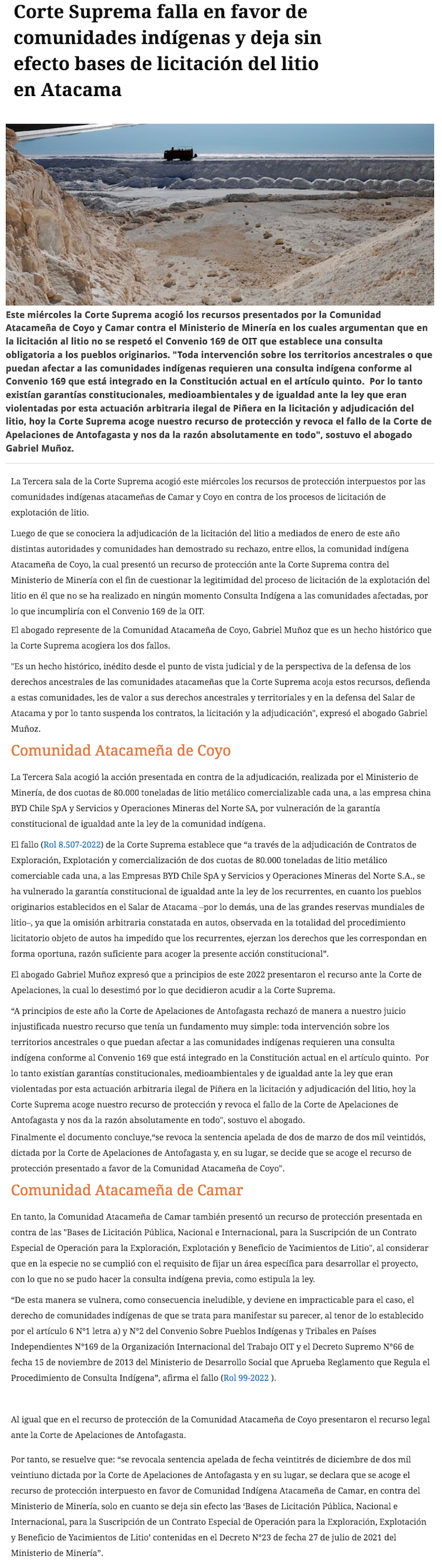 Corte Suprema acoge recursos de comunidades indígenas por litio - (Pulso)