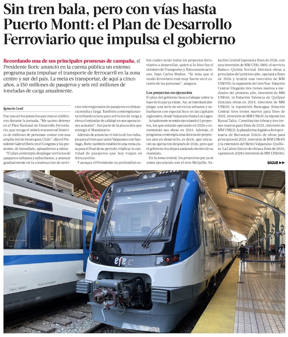 Presidente Boric pide “trabajar en serio” para concretar tren Santiago-Valparaíso - (El Mercurio de Santiago)