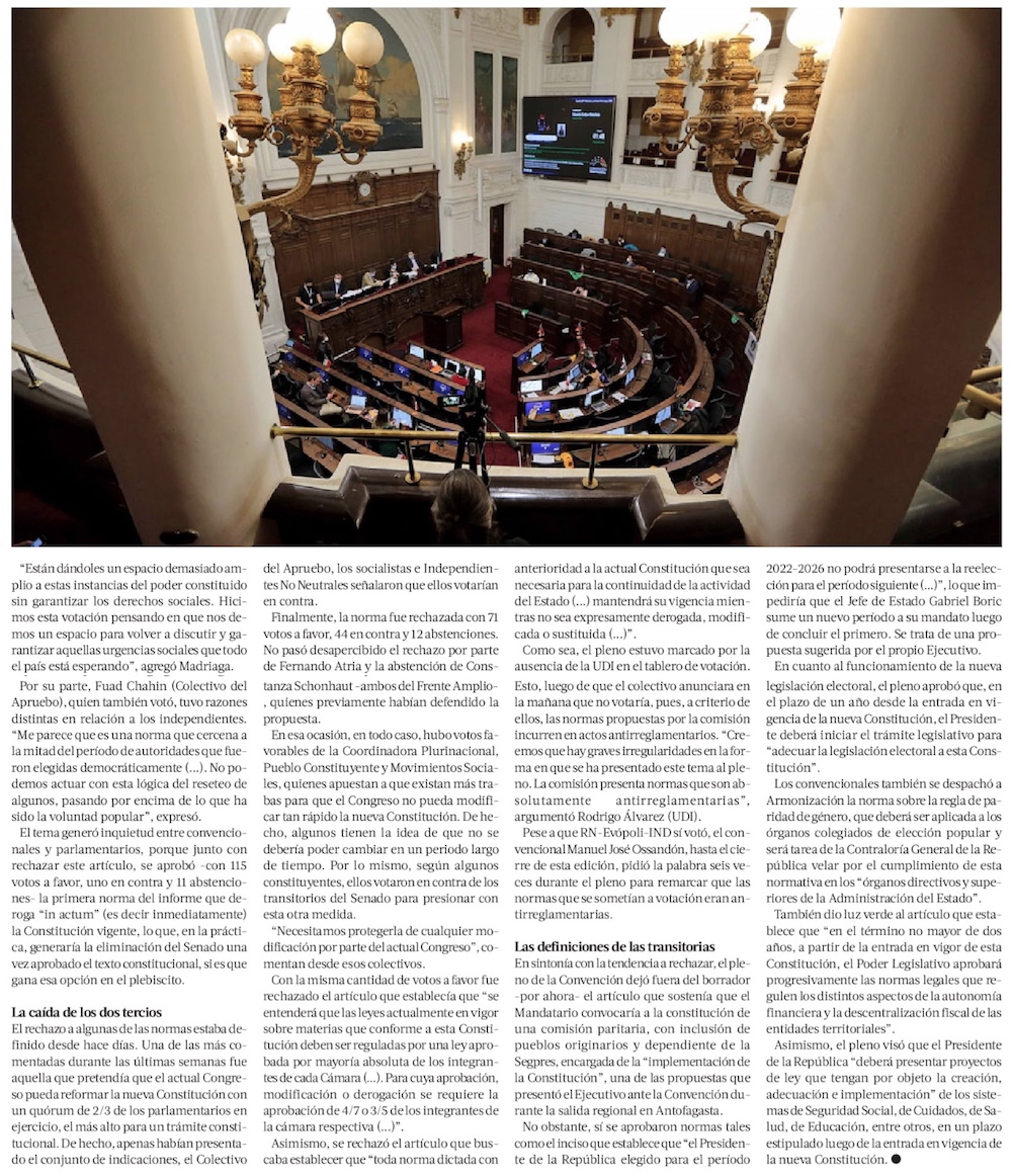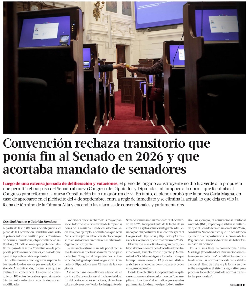 Se rechaza quorum transitorio de 2/3 y fin del Senado en 2026, con desmarque de grupos de izquierda y sectores de escaños reservados - (El Mercurio de Santiago)