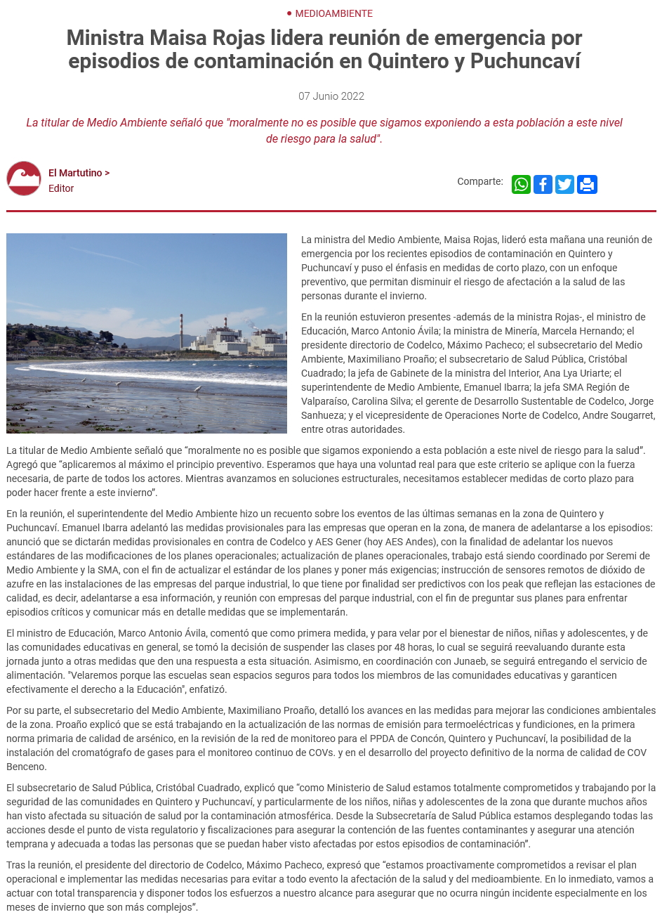 Quintero: Ministra Rojas dice que "moralmente" no es aceptable exponer a la población y SMA anuncia medidas preventivas - (emol)