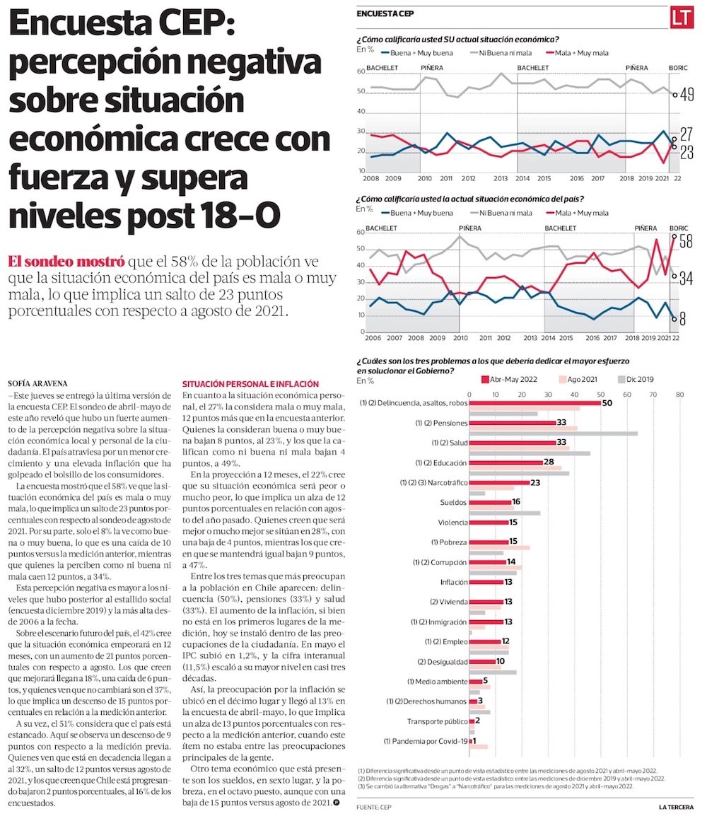Las claves de la CEP: Pesimismo, delincuencia, estrecha disputa entre el Apruebo y el Rechazo y una dura evaluación para el gobierno - (La Tercera)