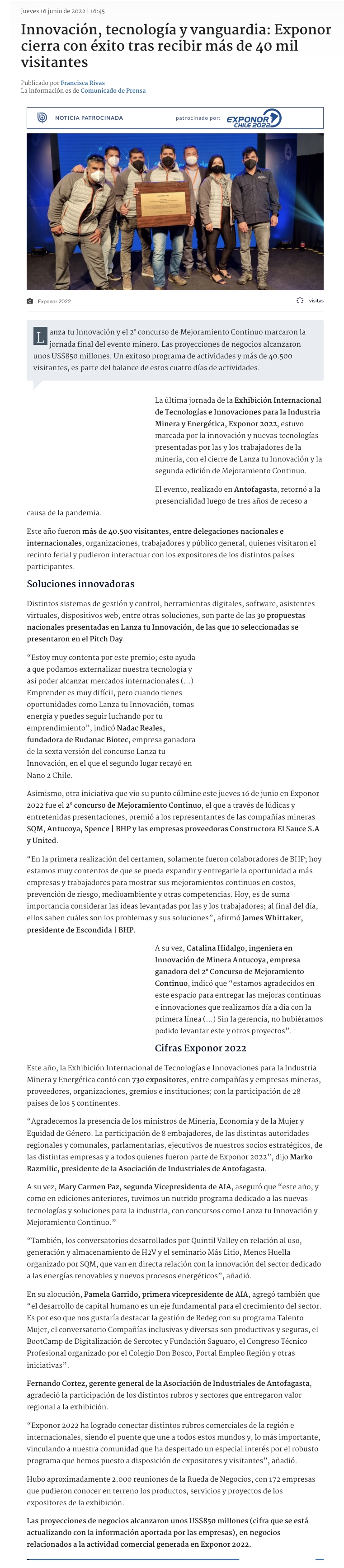Exponor 2022: AIA proyecta negocios por US$850 millones tras balance del encuentro - (El Mercurio de Antofagasta)