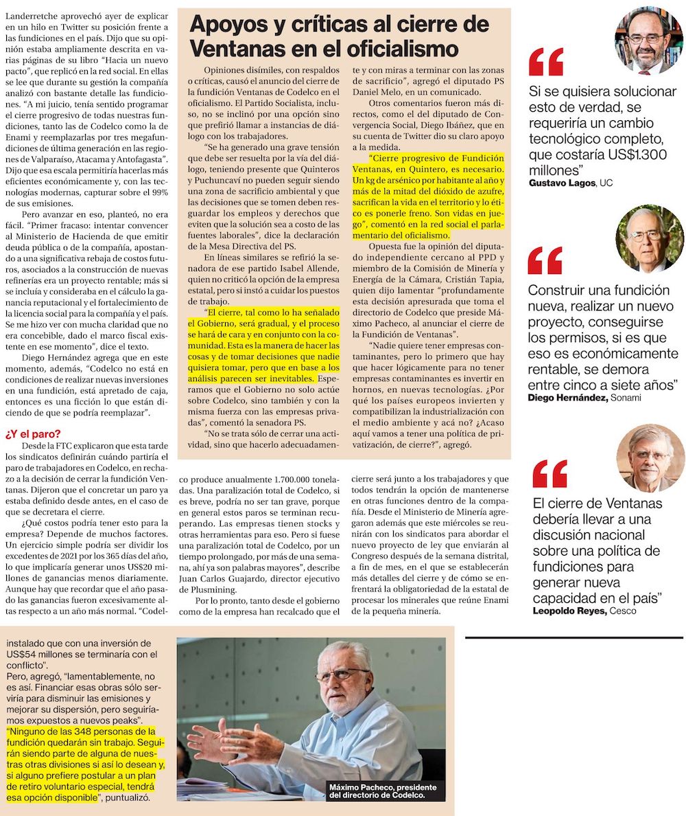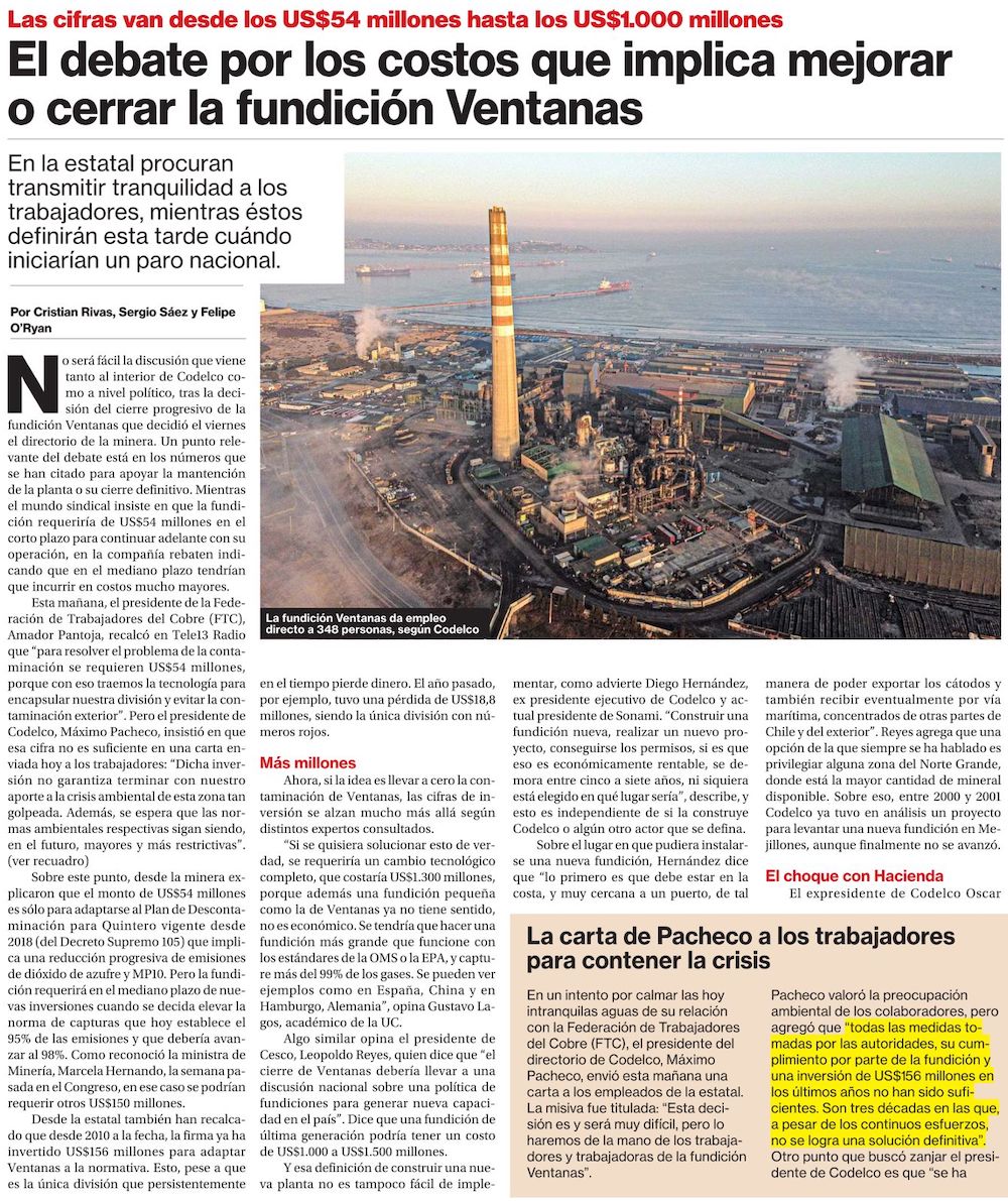 Paro de Codelco por cierre de fundición Ventanas podría costar hasta US$ 30 millones diarios - (El Mercurio de Santiago)