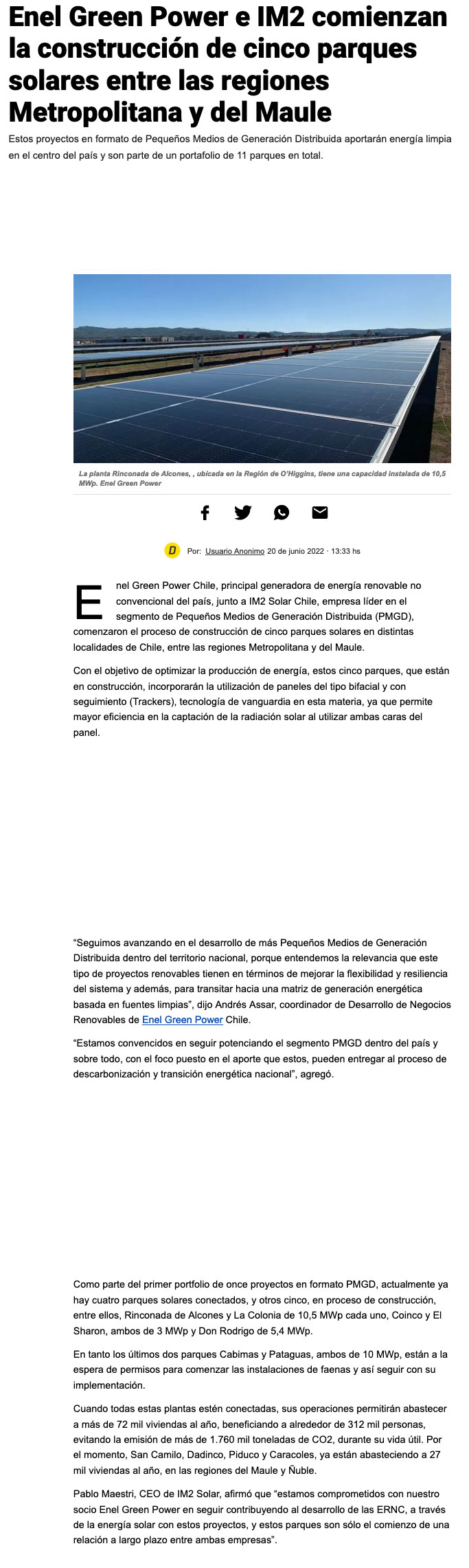Enel Green Power e IM2 avanzan en el desarrollo de parques solares en el centro del país - (Pulso)