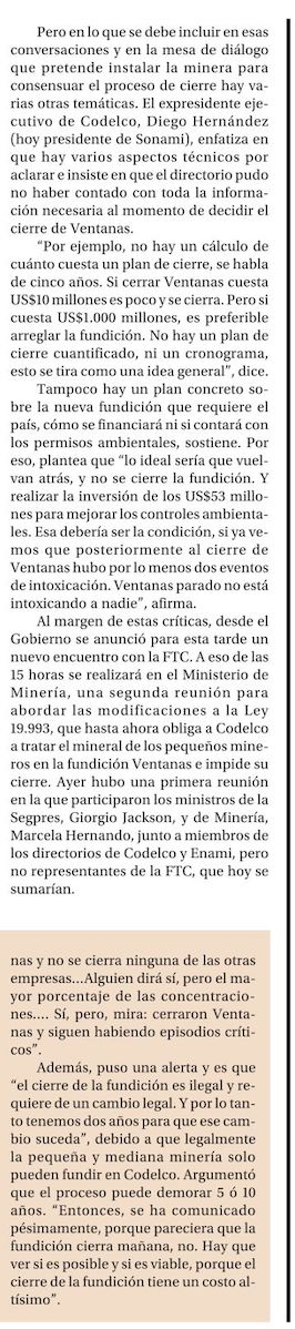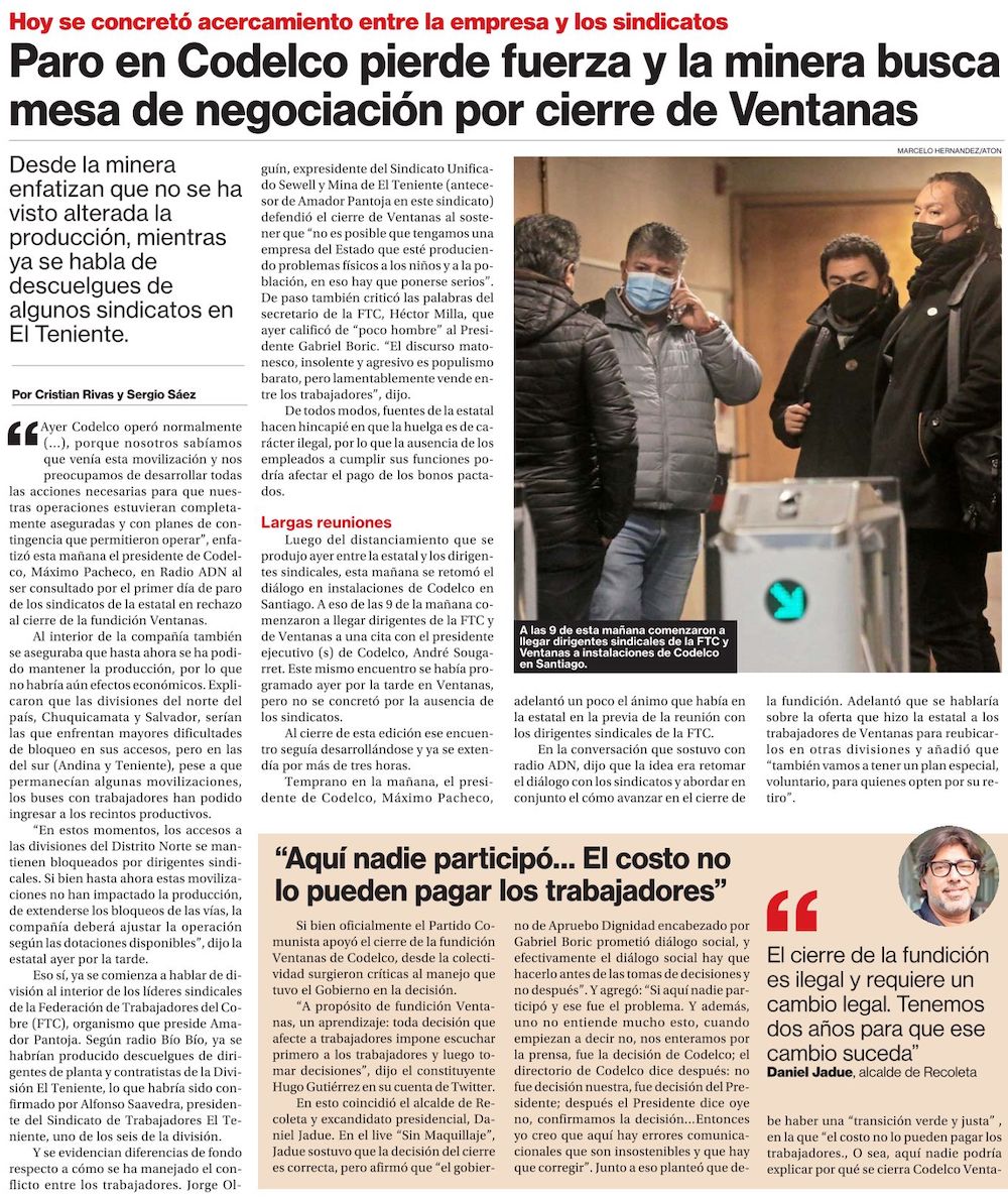 Codelco logra acuerdo con sindicatos, y deponen huelga tras anuncio de cierre de Ventanas - (El Mercurio de Santiago)