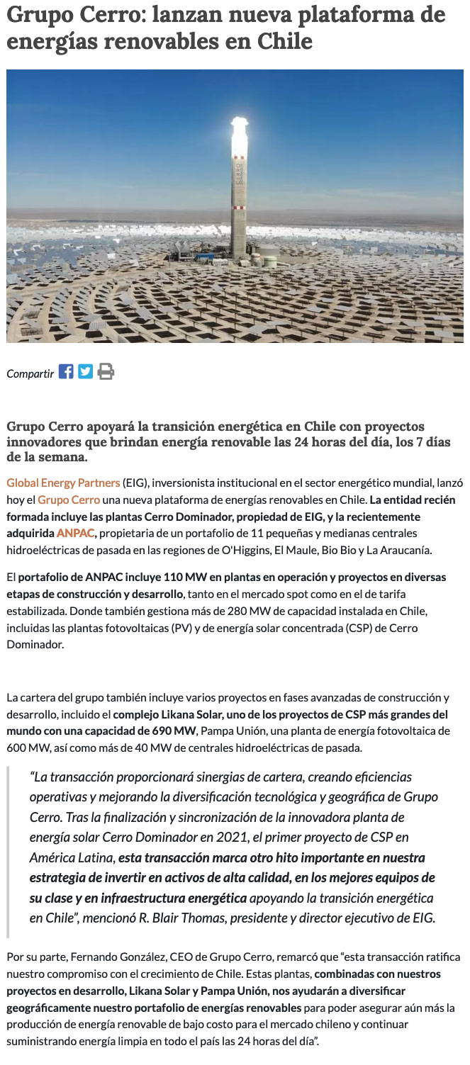 Grupo Cerro invertirá US$ 800 millones en proyectos solares - (El Mercurio de Calama)