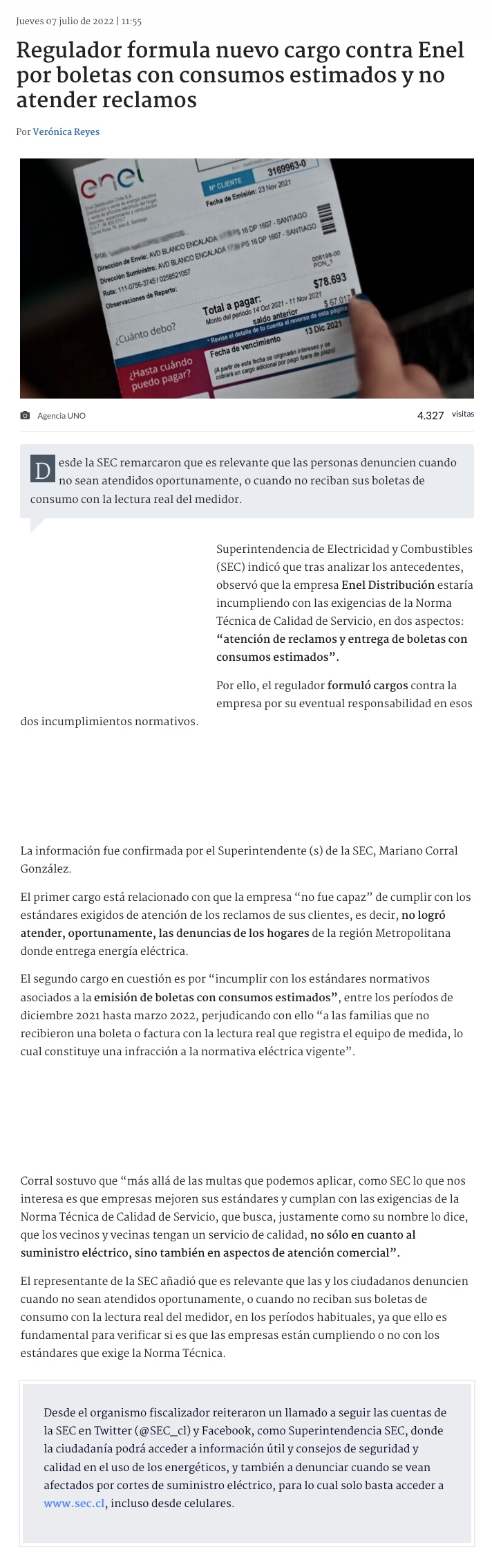SEC formula cargos contra ENEL por emisión de boletas y problemas en la atención a clientes - (cooperativa online)