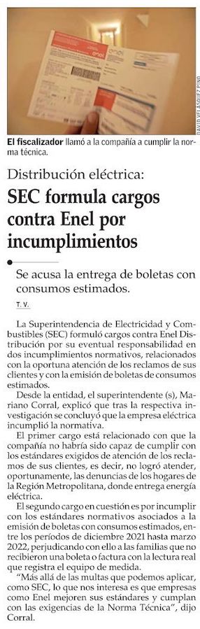 SEC formula cargos a Enel por no atender reclamos y boletas con consumos estimados - (Diario Financiero)
